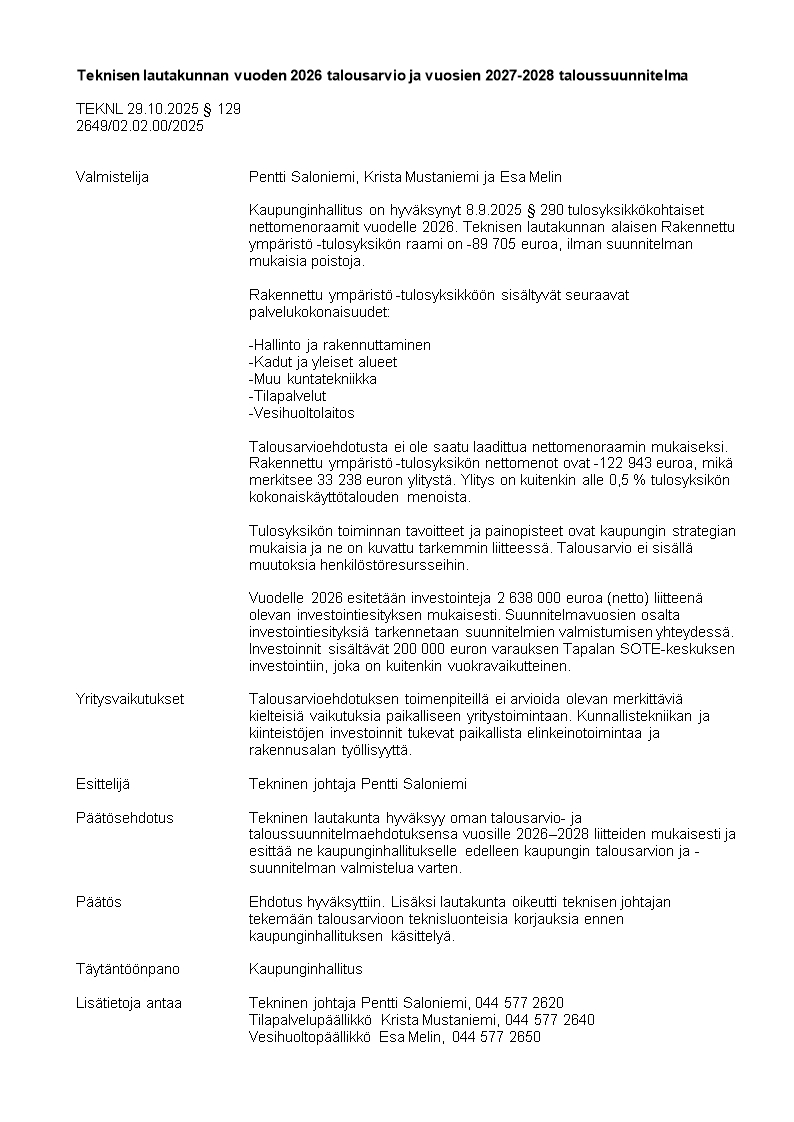 Pöytäkirja 29.10.2025/Pykälä 129