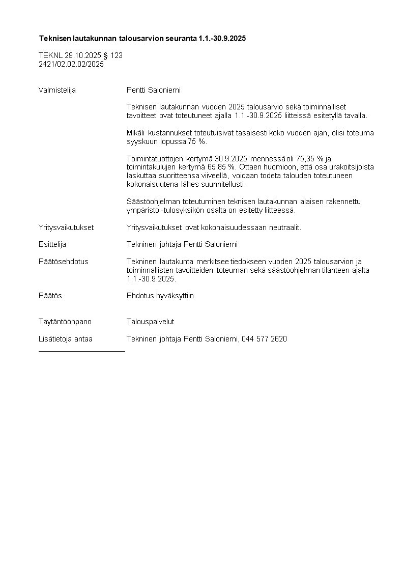 Pöytäkirja 29.10.2025/Pykälä 123